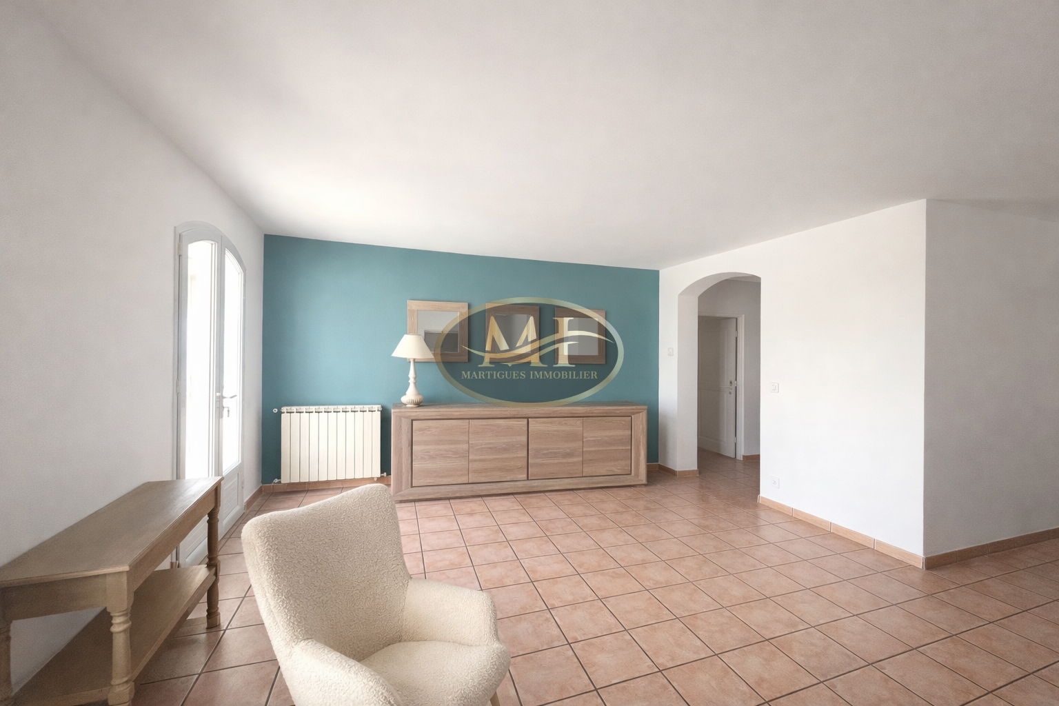 Un beau séjour lumineux, une cuisine, un bureau ou buanderie et un WC.