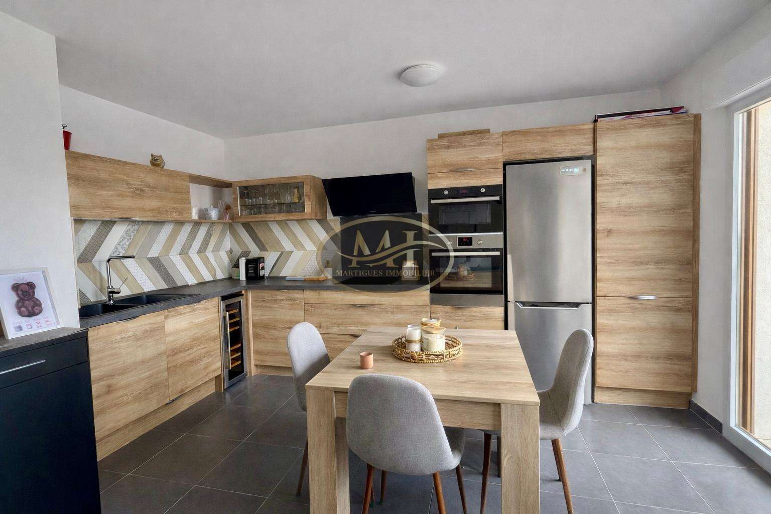 La pièce de vie lumineuse accueille une cuisine moderne entièrement équipée ouverte sur l'espace salon et salle à manger, créant un lieu de vie convivial et chaleureux.