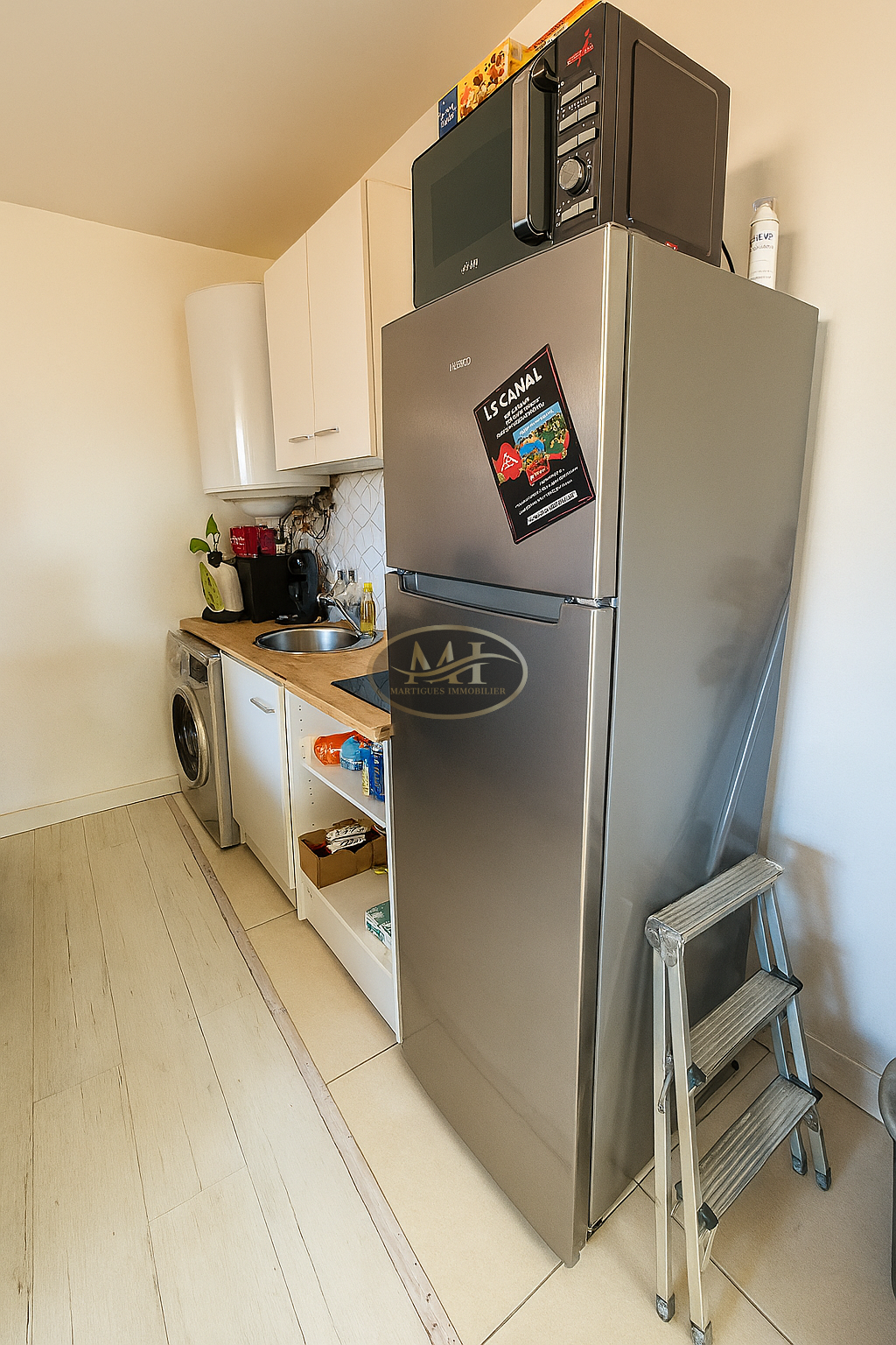Il comprend une pièce de vie optimisée, une salle d’eau et un WC séparé.