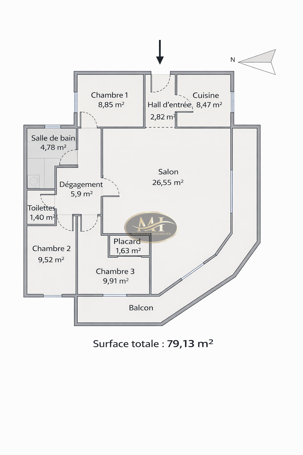 Il développe une organisation fonctionnelle comprenant une entrée avec espaces de rangement, une cuisine aménagée indépendante, un séjour lumineux prolongé par un balcon, trois chambres, une salle de bains ainsi que des toilettes séparées
